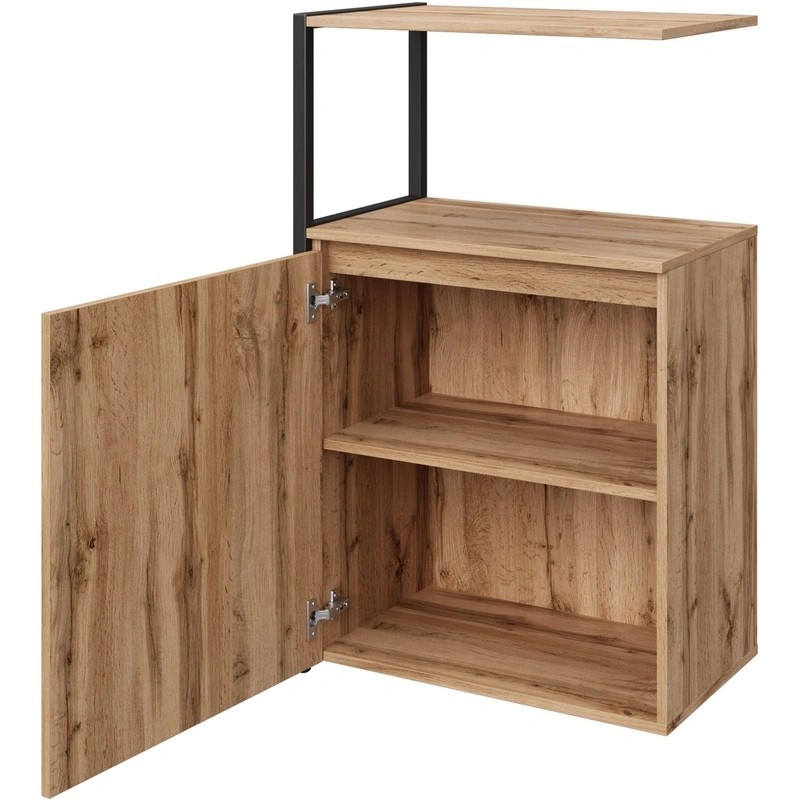 Шкаф-дополнение 645х400х1068 мм. Артикул 241H023. Верхняя крышка стеллажа выполнен из ЛДСП толщиной 22 мм с кромкой из ABS-пластика толщиной 2 мм по передней стороне. Остальные детали, включая заднюю стенку, изготовлены из ЛДСП толщиной 16 мм с кромкой из ABS-пластика толщиной 1 мм и 0,5 мм. Стеллаж установлен на регулируемые по высоте опоры чёрного цвета. Материал и толщина каркаса и его кромки — ЛДСП толщиной 16 мм, кромка из ABS-пластика толщиной 1 мм и 0,5 мм. Материал и толщина задней стенки — ЛДСП толщиной 16 мм. Возможно доукомплектовать дверями (ЛДСП или стекло). Количество ниш для папок — 3 шт.