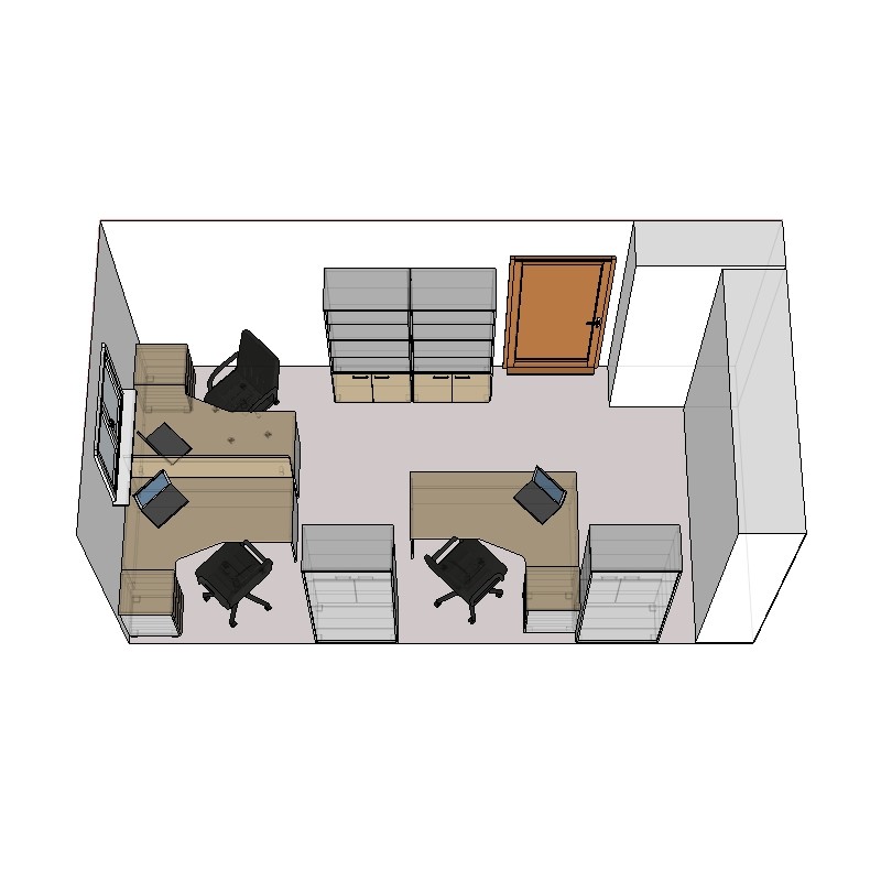 Готовый проект офисной мебели для прямоугольного помещения в 22,4 м2 . Ширина кабинета примерно 3,82..