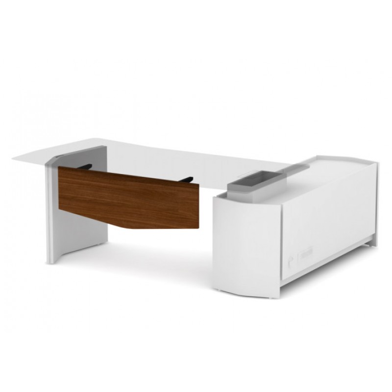Столешница стола выполнена из МДФ 19 мм и облицована с одной стороны пленкой PVC толщиной 0,4 мм, а с другой – шпоном натурального дерева (орех). Стенки и фасады тумбы опорной изготовлены из МДФ 16 мм, облицованной шпоном ореха с финишной отделкой матовым лаком. Остальные детали изготовлены из ДСП 18 мм. На ящиках установлены Quadro направляющие полного выдвижения (надвижного монтажа) бесшумного и плавного хода. Полное выдвижение ящика обеспечивает удобство доступа по всей его глубине. На фасадах тумб с ящиками выдвижными отсутствует лицевая фурнитура. В нижнем углу опорной тумбы установлена решетка чёрного цвета для вентиляции производства GTV (Польша). В столах предусмотрен кабель-менеджмент производства компании ASA (Италия) для прокладки и вывода кабелей на рабочую поверхность. Для повышения удобства эксплуатации столы рабочие оснащены регулировочными винтами, компенсирующие возможные неровности пола в диапазоне 10-15 мм.