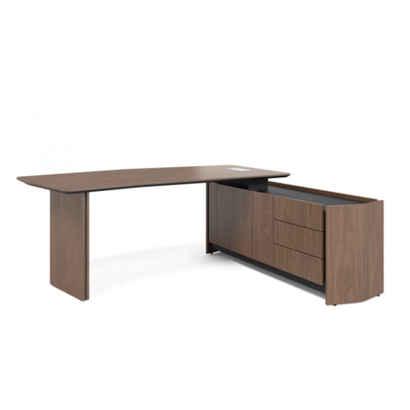 Столешница стола выполнена из МДФ 19 мм и облицована с одной стороны пленкой PVC толщиной 0,4 мм, а с другой – шпоном натурального дерева (орех). Стенки и фасады тумбы опорной изготовлены из МДФ 16 мм, облицованной шпоном ореха с финишной отделкой матовым лаком. Остальные детали изготовлены из ДСП 18 мм. На ящиках установлены Quadro направляющие полного выдвижения (надвижного монтажа) бесшумного и плавного хода. Полное выдвижение ящика обеспечивает удобство доступа по всей его глубине. На фасадах тумб с ящиками выдвижными отсутствует лицевая фурнитура. В нижнем углу опорной тумбы установлена решетка чёрного цвета для вентиляции производства GTV (Польша). В столах предусмотрен кабель-менеджмент производства компании ASA (Италия) для прокладки и вывода кабелей на рабочую поверхность. Для повышения удобства эксплуатации столы рабочие оснащены регулировочными винтами, компенсирующие возможные неровности пола в диапазоне 10-15 мм.