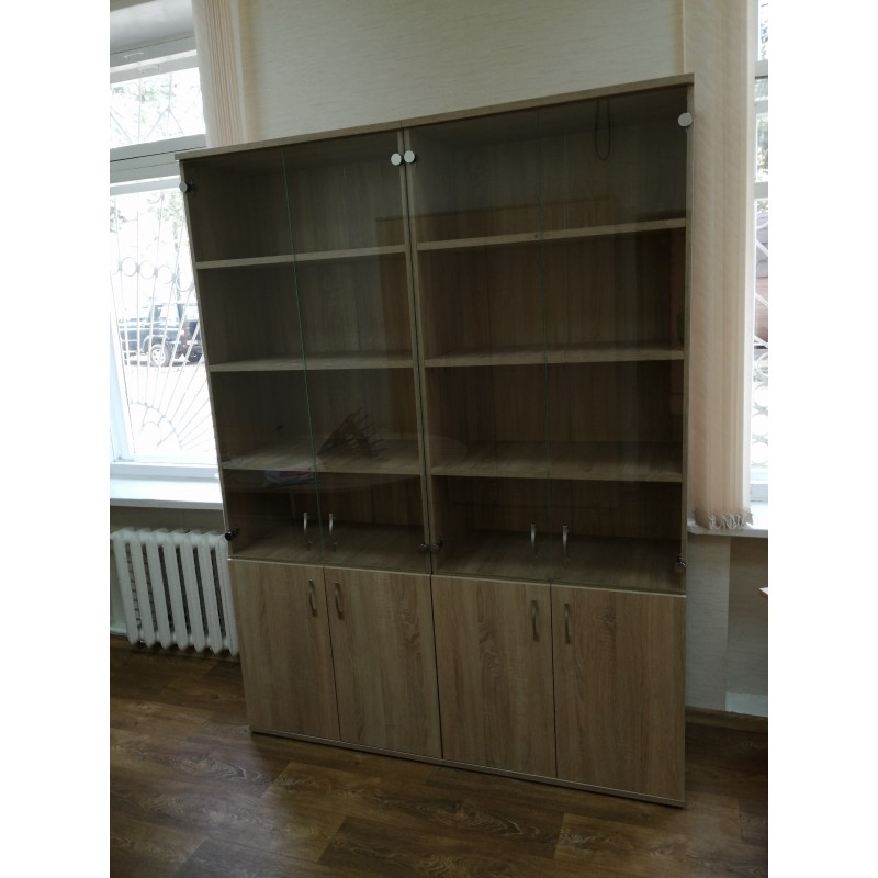 Набор шкафов со стеклом для офиса изготавливается размером 1600*450*2155 мм. Имеет 6 полок. Толщина материалов 22 мм. Дверцы стеклянные, толщиной 5 мм.