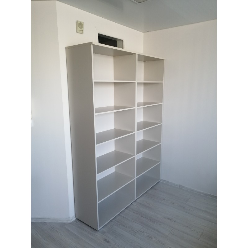 Размеры 1572*420*2105 h мм. Толщина материалов 18 мм. Папки корона и другие становятся на полки по высоте.