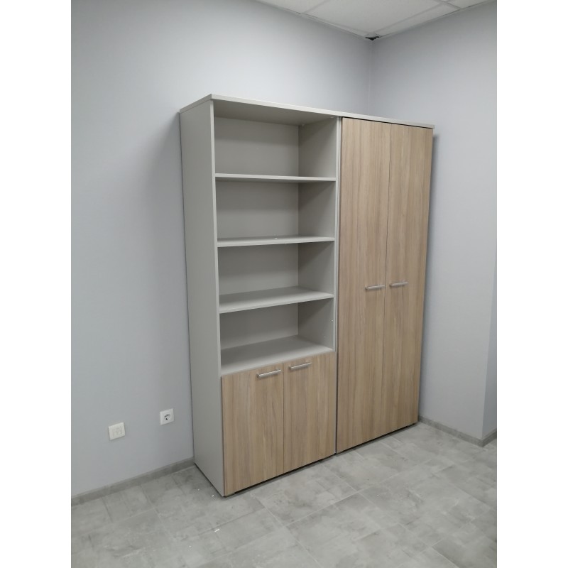 Набор высоких шкафов для офиса 76Н005-013053 состоит из двух стеллажей на шесть полок и двух дверей для двух полочек и для всех шести полочек. Размеры 1572*420*2105 h мм. Толщина материалов 18 мм. Папки корона и другие становятся на полки по высоте. Шкафы имеют заднюю стенку в цвет каркаса шкафа, из ЛДСП толщиной 18 мм.