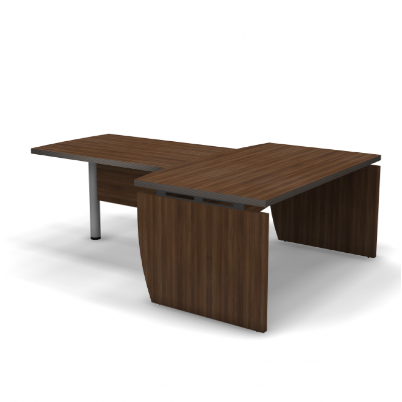 Столешницы и опоры столов руководителя изготовлены из 38 мм ДСП с двухсторонним меламиновым покрытием с декоративной кромкой 2 мм ABS. Столешницы облицованы декоративной кромкой 2 мм ABS с нанесенными полосами цвета «серебро». Царга столов изготовлена из 16 мм ДСП. Соединение столешниц и опор осуществляется через декоративную металлическую вставку черного цвета толщиной 40 мм, создающую эффект облегченной конструкции.